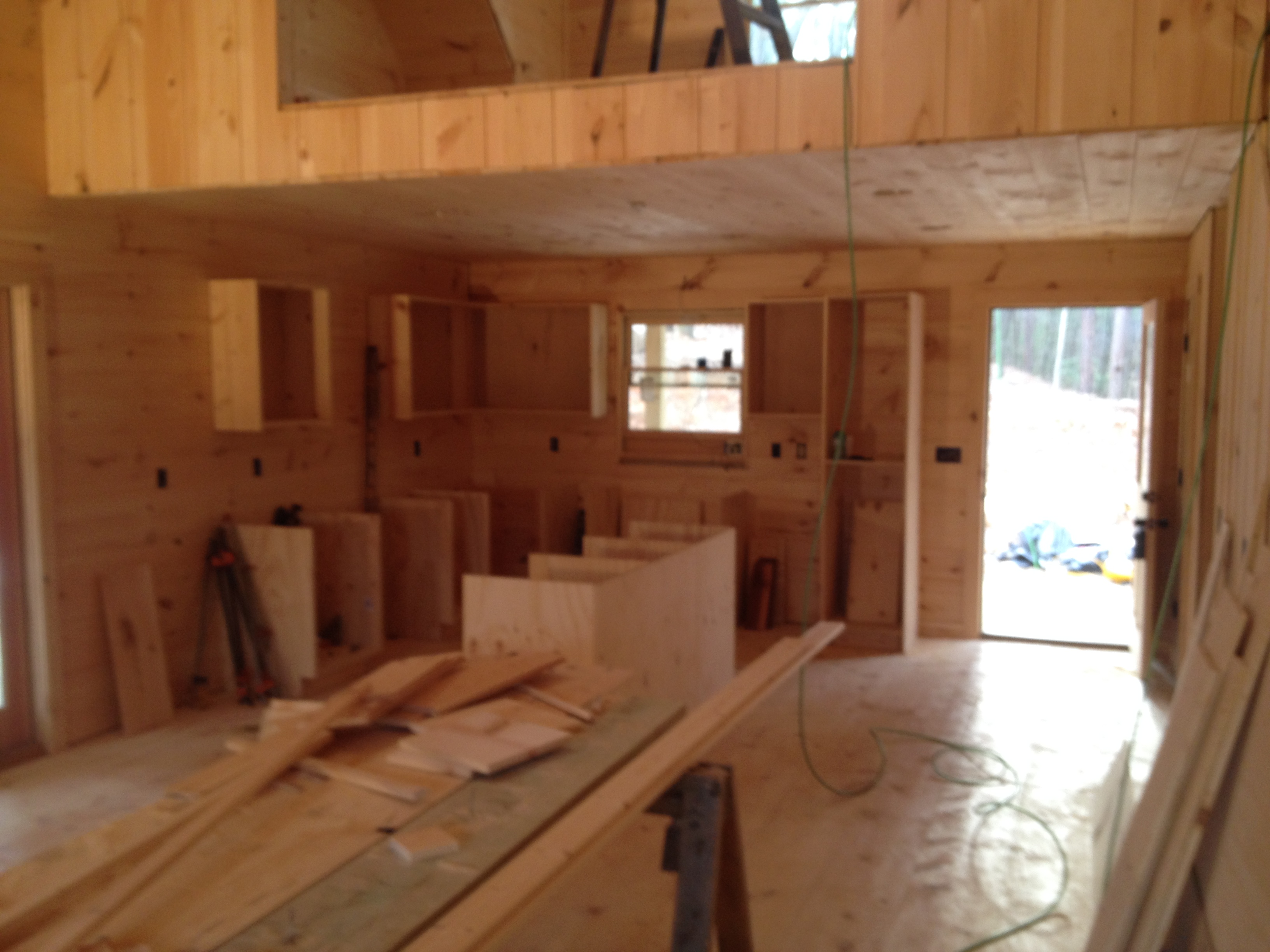The kitchen cabinets are also coming along. As you can tell, all of the cabinets are being built by hand on-site. It’s pretty cool to see these come together. The kitchen layout is standard. The sink will under the window and the stove will be on the left wall. The refrigerator will also be on the left wall, at the very end of the kitchen near the porch doors.The island will have an overhang for stools, and will be all one level. We had a short debate about a single-level versus a double-level island. It sounds like a dumb decision, but it affects the aesthetic, the height of stools, the size of stools, and the number of stools that can be fit in the kitchen. The single level counter will allow for more people to sit at the island, and will also allow for shorter, smaller stools that can be tucked out-of-the-way under the counter. Visually, I like that there won’t be anything to keep someone from looking past the kitchen to the view out the back doors.