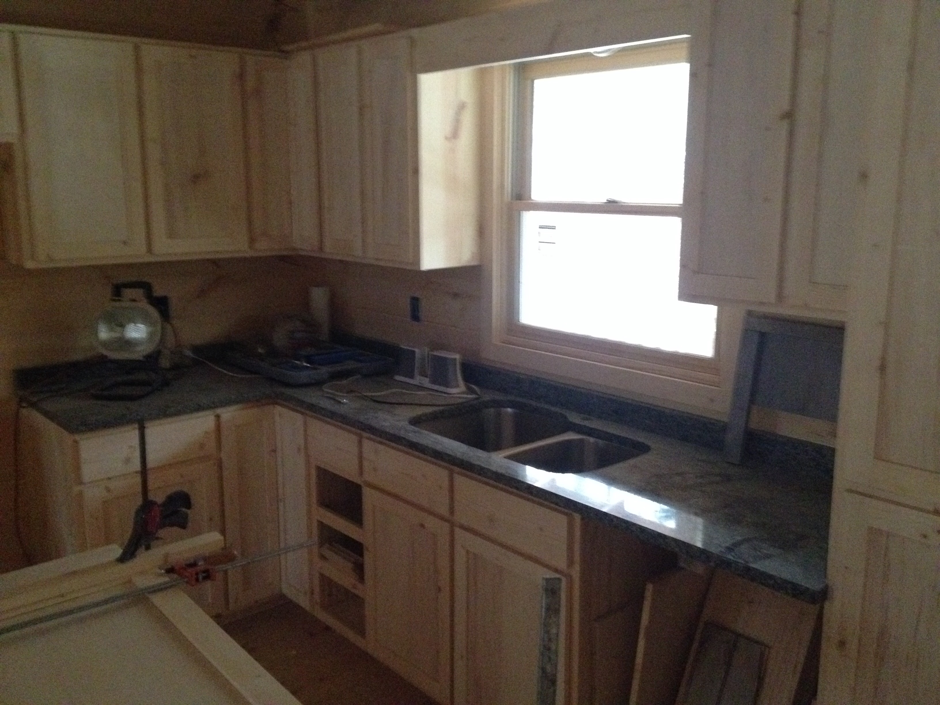 The kitchen counter and island are done! There’s a small section of cabinet door that is stained dark grey on the counter to the right of the sink showing the color that all of the cabinets will be.