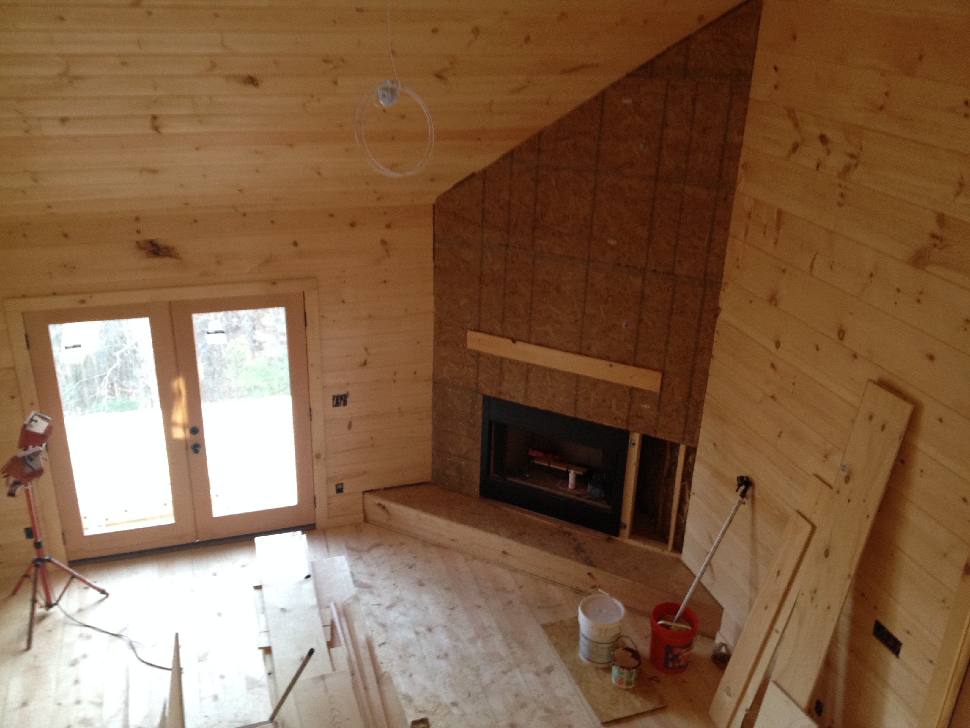You can also see the mantle below, which was installed this week. It’s just a chunk of a milled d-log. There’s a similar one on the fireplace outside, although it’s not as big.