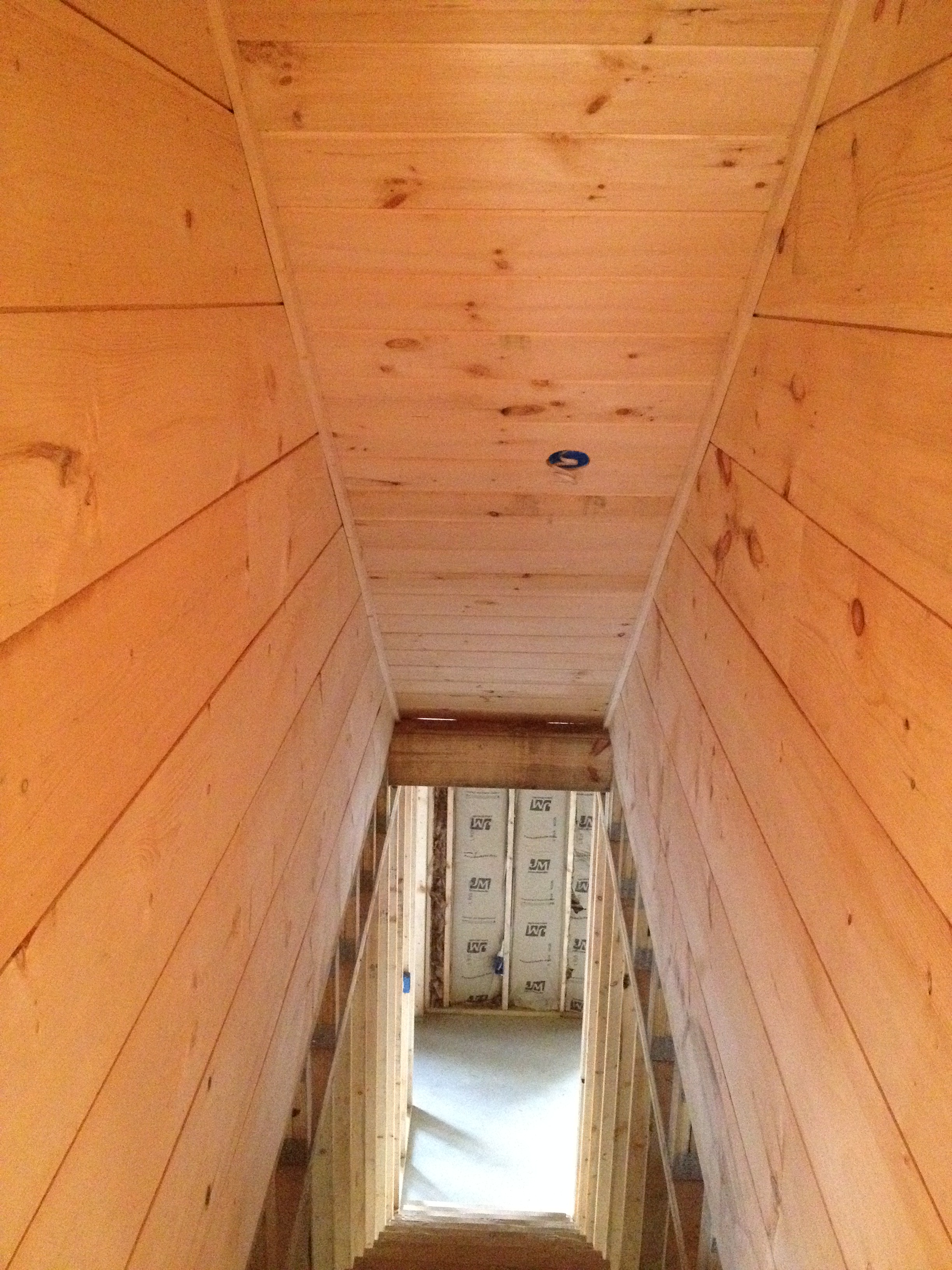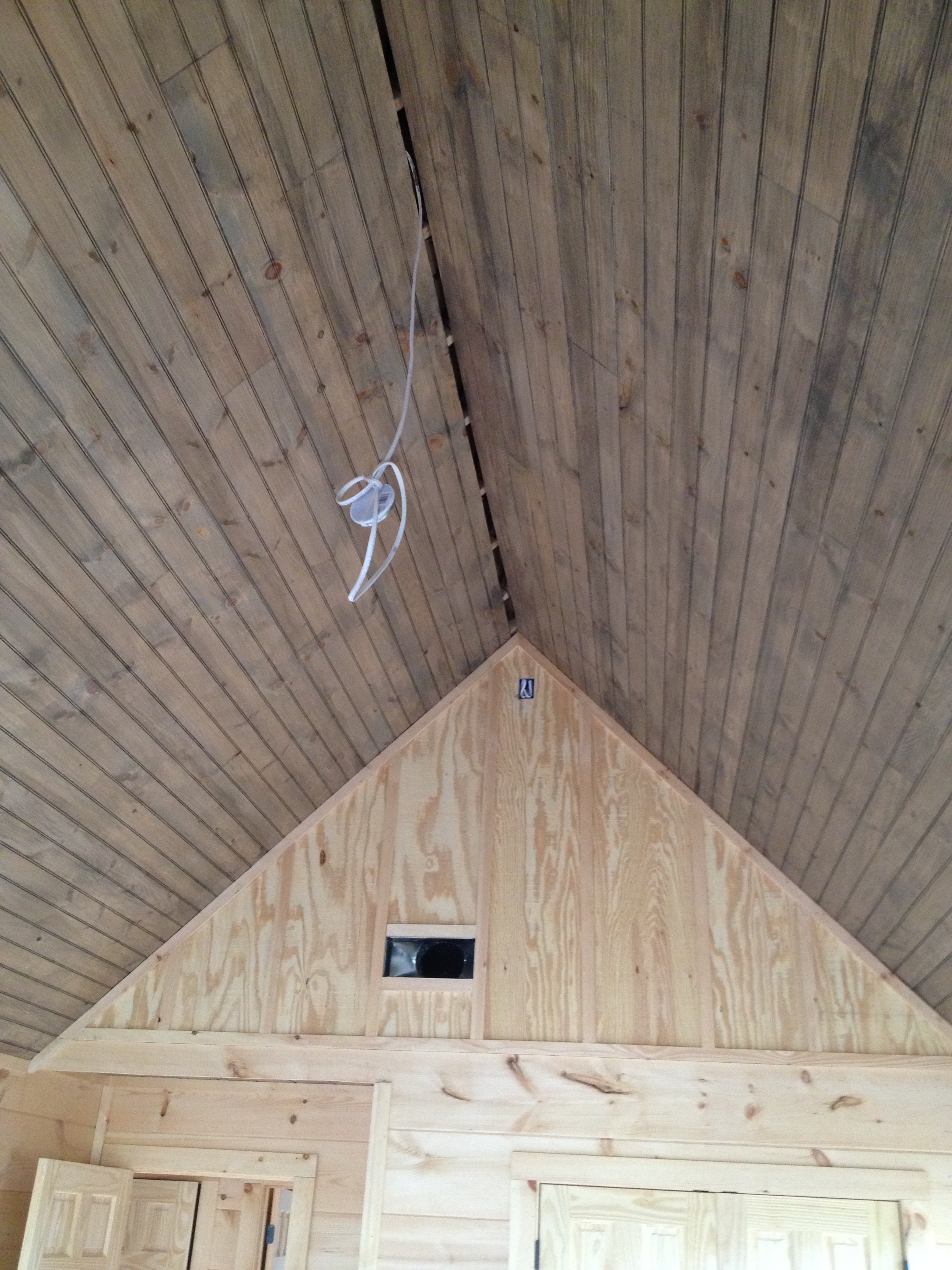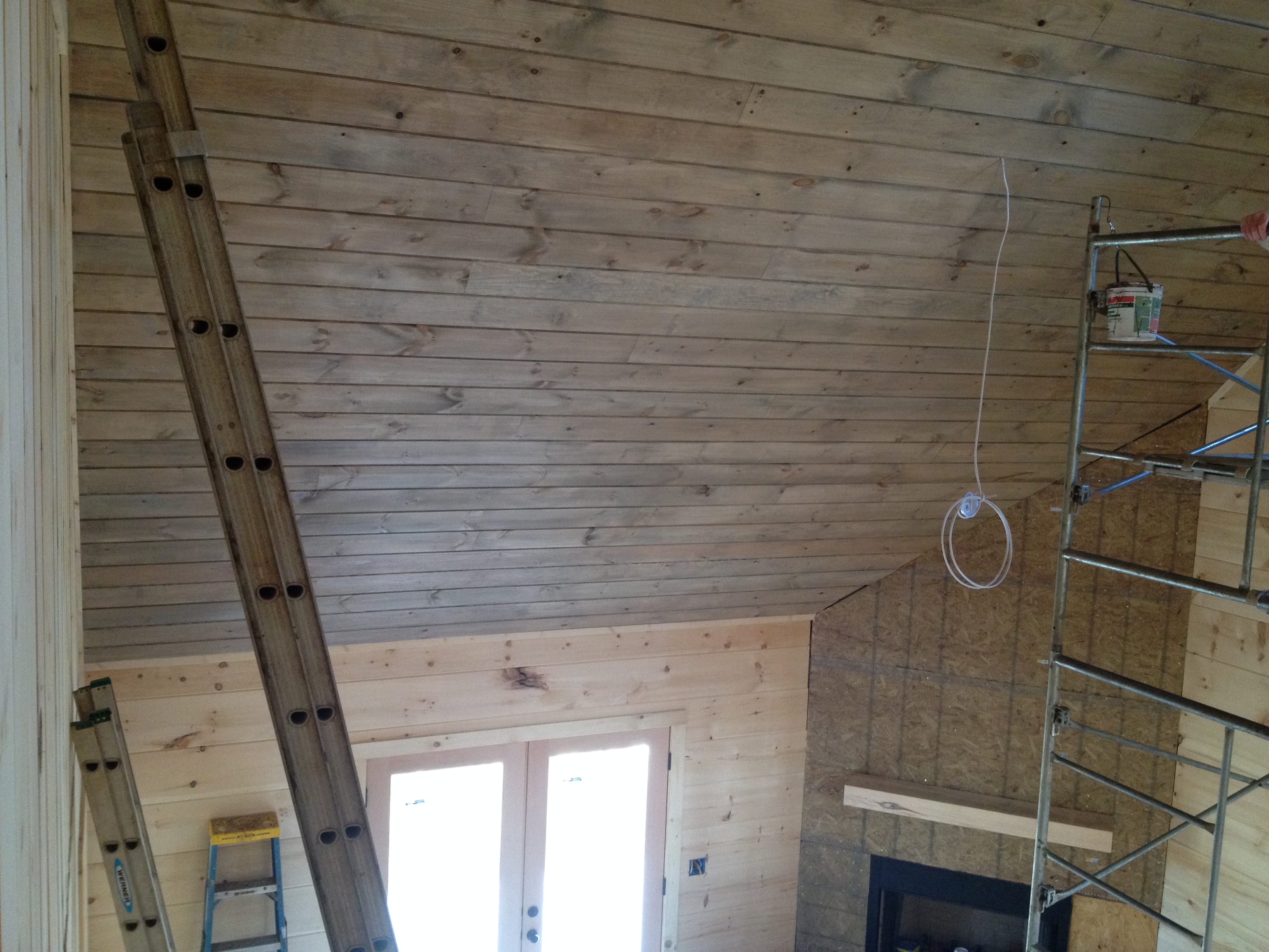 The staining activity has moved inside. All of the ceilings are done, except the living room which was about 75% complete, though rapidly moving along. The same color was used on every ceiling, including the bathrooms, hallways, and the office nook.