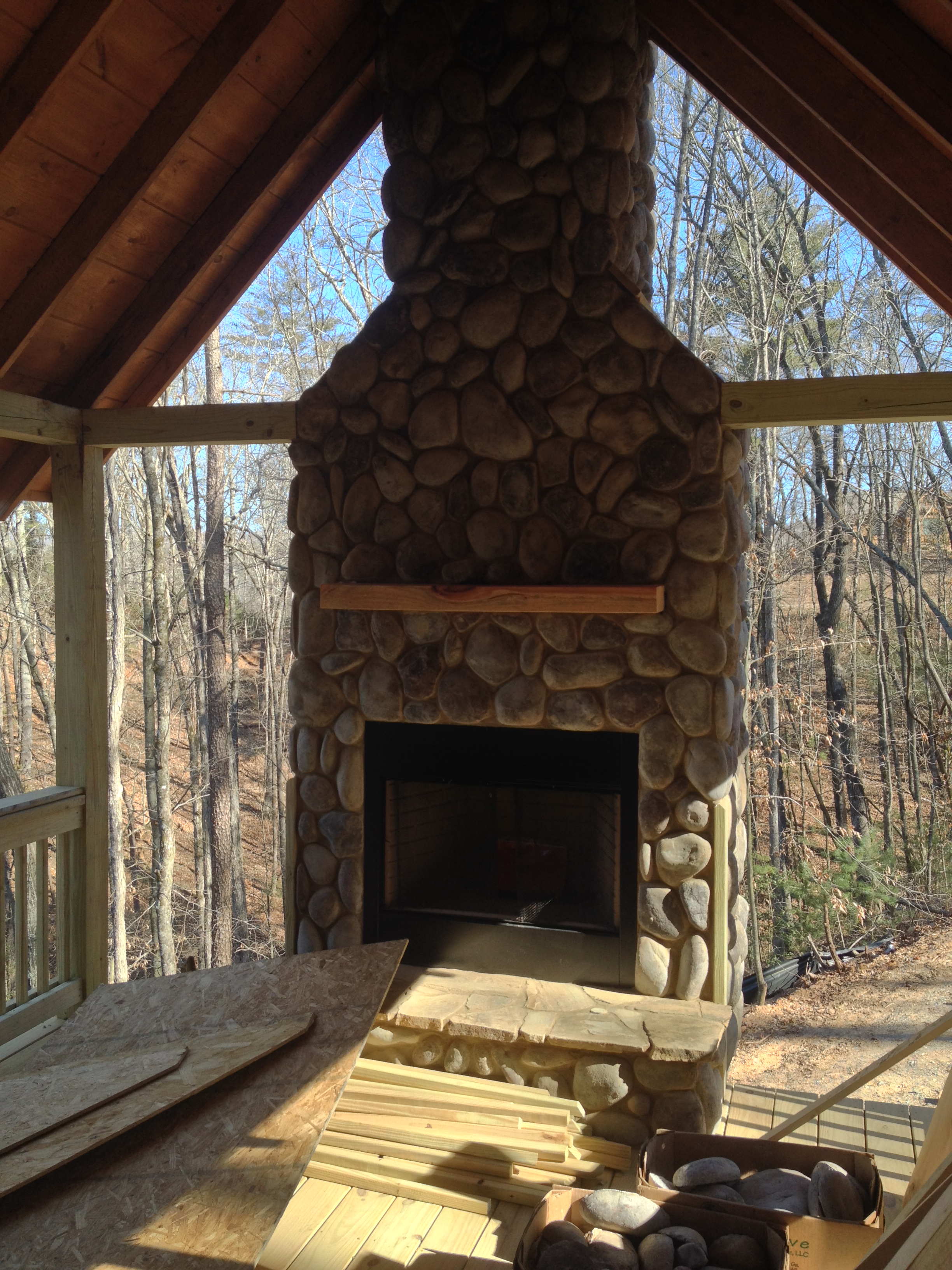 The fireplace rock goes all the way around and the porch feels well enclosed now with the rock and pickets in.