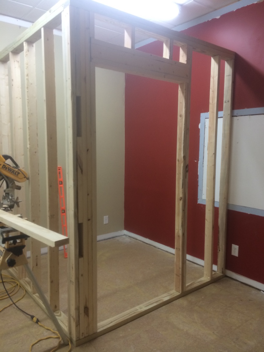 The second fitting room was also framed on Tuesday. Both of them are 6’x6′, so all but the tallest people can spread their arms completely out, airplane style, and not touch a wall. We want our fitting rooms to be super comfortable and inviting so that people want to keep trying on clothes!